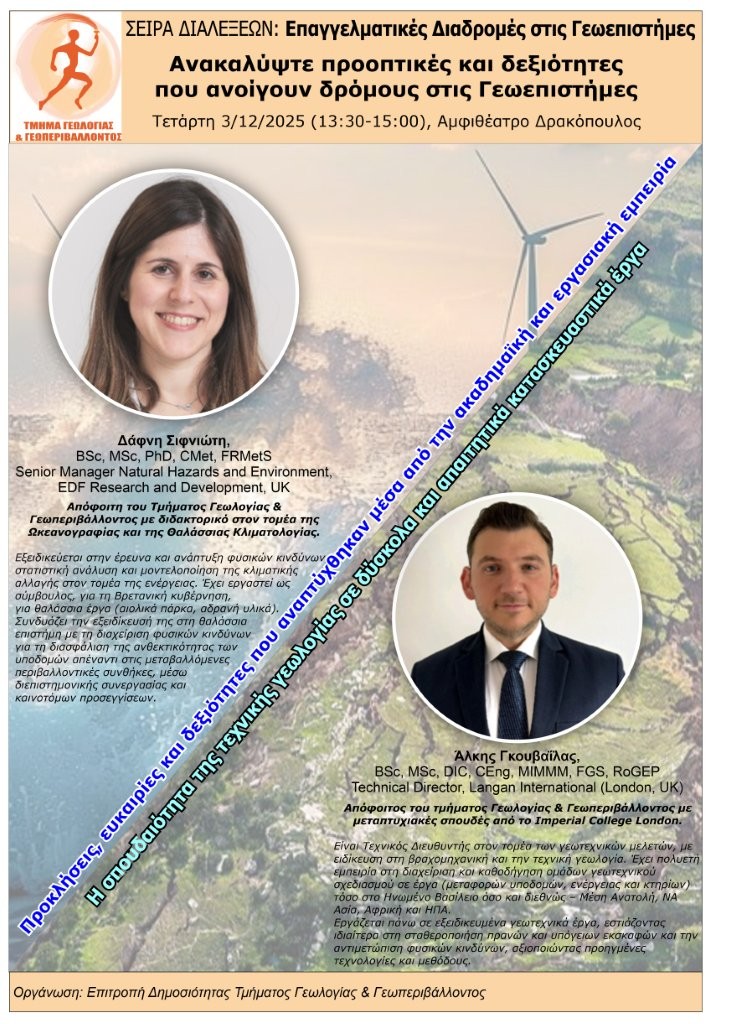 Η Επιτροπή Δημοσιότητας Τμήματος Γεωλογίας & Γεωπεριβάλλοντος σας προσκαλεί στη ΣΕΙΡΑ ΔΙΑΛΕΞΕΩΝ: Επαγγελματικές Διαδρομές στις Γεωεπιστήμες.